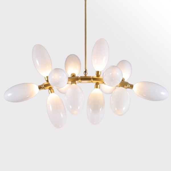 Каждая люстра состоит из большого количества плафонов нанизанных на алюминиевые подвижные позвонки. Что дает возможность видоизменять люстру, давать ей естественное ниспадание. Каждый плафон выдувается вручную - что дает особенное, в полном смысле этого слова, неповторимое, изящество.